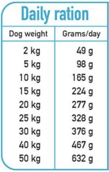SPOSÓB UŻYCIA: Pokarm odpowiedni dla psów wszystkich ras. Jako odniesienie należy przyjąć tabelę zalecanych dziennych ilości (podane ilości mają charakter orientacyjny). Ilość karmy może się różnić w zależności od aktywności, rasy psa i warunków środowiskowych. Psy powinny zawsze mieć czystą, świeżą wodę. Przechowywać pojemnik szczelnie zamknięty, w chłodnym, suchym i wentylowanym miejscu, z dala od światła i słońca.