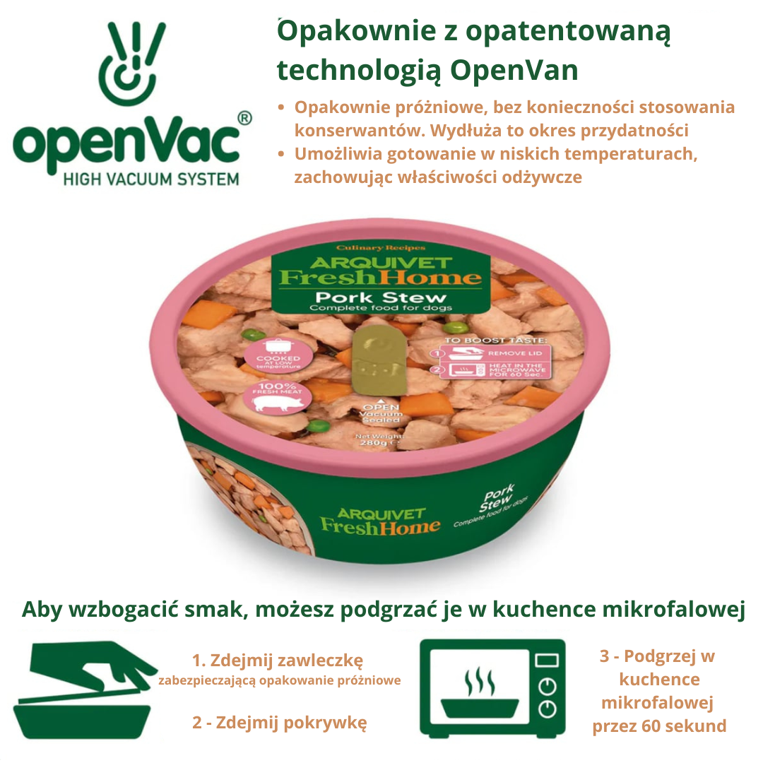 W karmie ARQUIVET FreshHome Gulasz Wieprzowy znajdziesz pełnowartościowo zbilansowany posiłek dla ukochanego czworonoga.