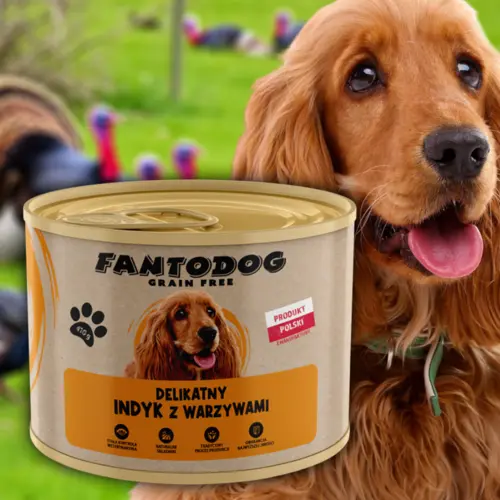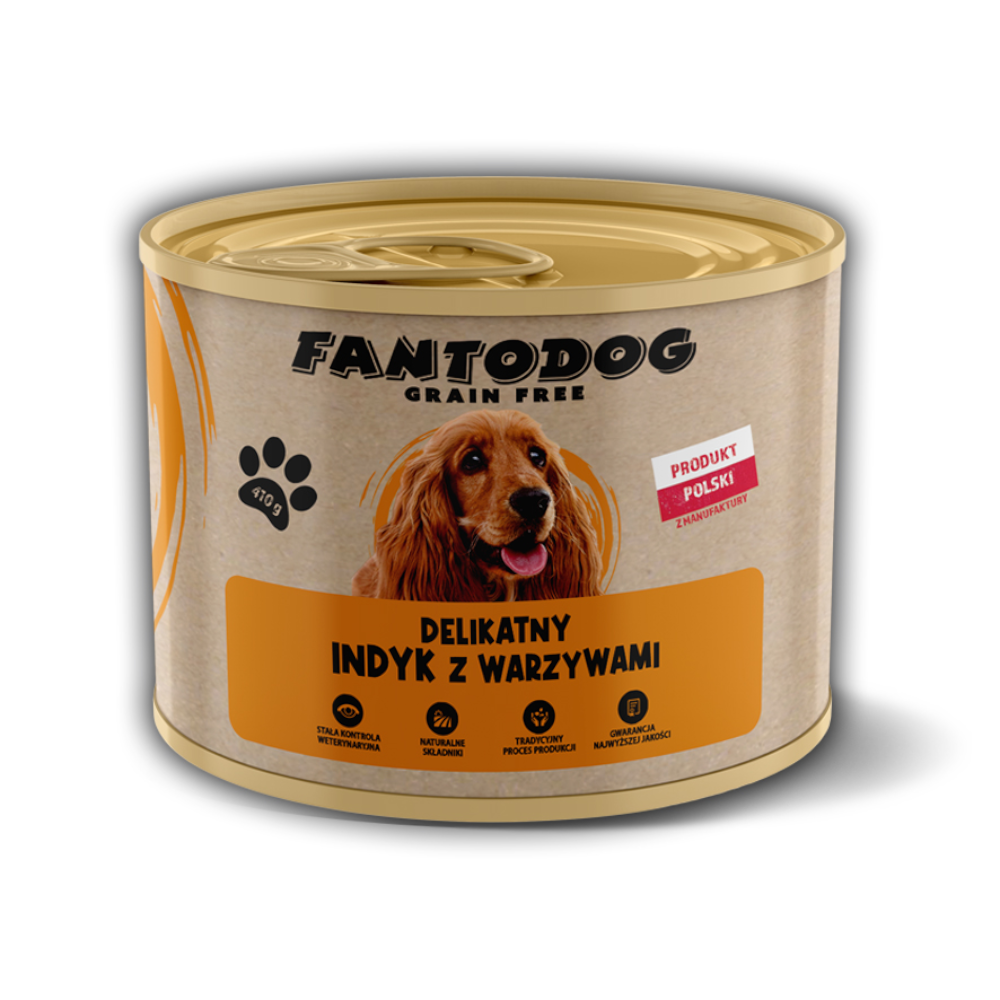 FantoDog Delikatny Indyk z Warzywami pełnoporcjowa karma ze świeżego mięsa w puszce z polskiej manufaktury. Kompozycja składników karmy FantoDog Delikatny Indyk z Warzywami gotowana jest w sosie własnym bez dodatku wody oraz bulionu. Do karmy FantoDog Delikatny Indyk z Warzywami nie dodano zbóż, sztucznych barwników, konserwantów czy też wzmacniaczy smaków. Odpowiednia dla psów z nietolerancją lub nadwrażliwością na zboża zawierające gluten.