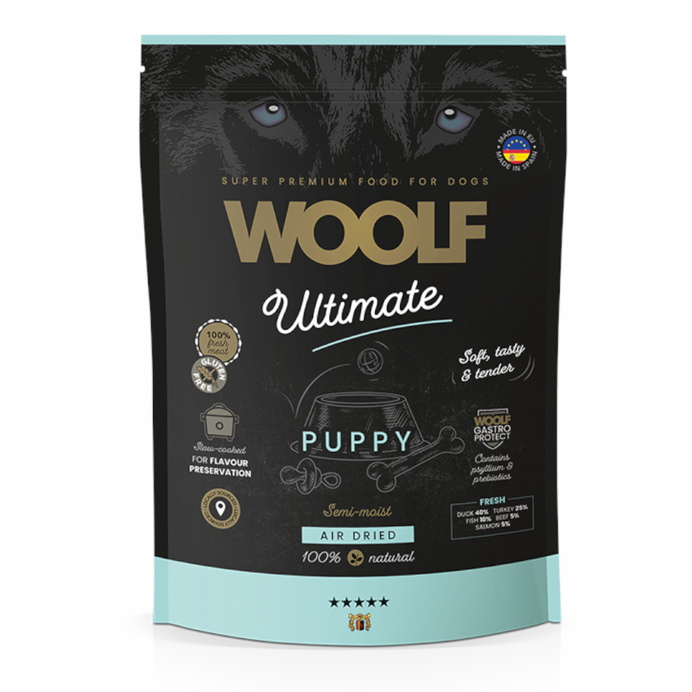 Woolf Ultimate Dog Puppy - pełnoporcjowa karma półwilgotna z kompozycją świeżych mięs: kaczką z indykiem dla szczeniąt.